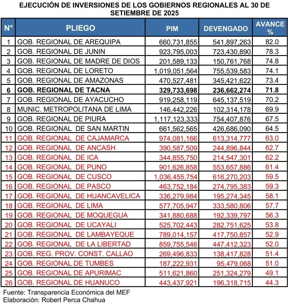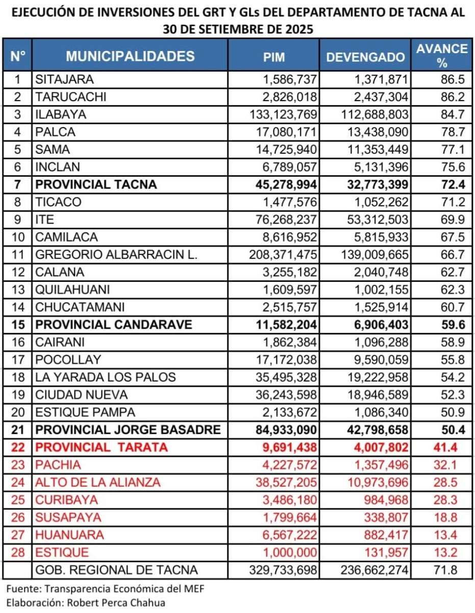 Robert Perca, especialista en inversión pública, detalló que los gobiernos locales a nivel nacional muestran el menor avance presupuestal (48.3%), muy por debajo del 75% esperado a estas alturas del año. En Tacna, aunque el Gobierno Regional figura en el sexto lugar nacional con un 71.8% de ejecución, es también uno de los que menos presupuesto total recibe para inversión.