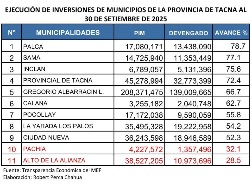 A pocos meses de cerrar el 2025, un análisis de ejecución presupuestal revela profundas desigualdades en la gestión del gasto público en Tacna. Mientras algunos municipios administran presupuestos millonarios, otros no logran ejecutar ni la mitad de sus fondos, pese a estar en su tercer año de gestión.