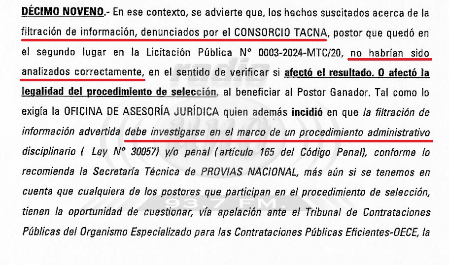 Como se recuerda, al conocerse como ganador de buena pro al «Consorcio Chino» desde Lima difundieron una serie de irregularidades sobre el mismo. De igual forma – según el documento judicial- el postor que quedó en segundo lugar Consorcio Tacna denunció filtración de información que agrava el proceso, mismo que – como es sabido- fue dado a conocer el 14 de junio de 2025 por el propio Ministerio de Transporte y Comunicaciones mencionando haber recibido una carta advirtiendo una reunión del comité seleccionador y postor del proceso en ambientes del Hotel Country Club de San Isidro, en Lima el 28 de mayo.