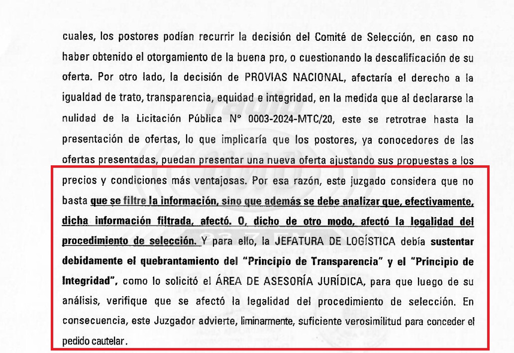 No obstante tal información no habría sido debidamente sustentada, y es que según la documentación judicial hoy conocida- «el juzgado considera que no basta que se filtre la información, sino que además se debe analizar que, efectivamente, dicha información filtrada, afectó o dicho de otro modo, afectó la legalidad del procedimiento de selección. Y para ello, la Jefatura de Logística debía sustentar debidamente el quebramiento del principio de transparencia y el principio de integridad, como lo solicitó el área de Asesoría Jurídica para que luego de su análisis, verifique que se afectó la legalidad del procedimiento de selección».