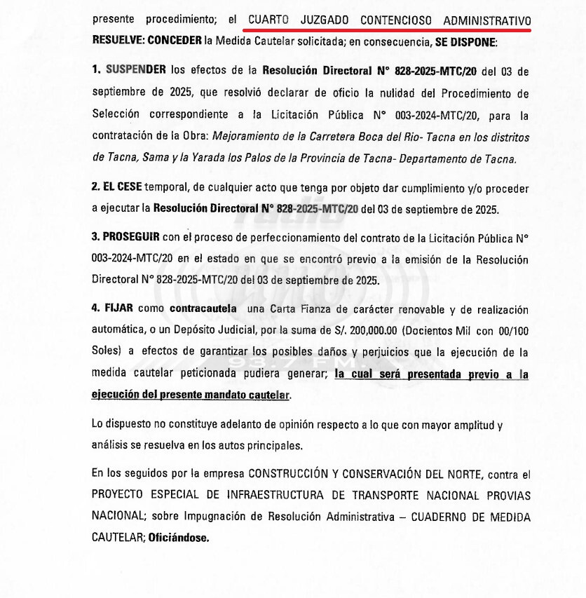 Según el documento firmado por Wu Xiaoxuan, representante común del «Consorcio Chino» que adjunta la cautelar; el Cuarto Juzgado Especializado en lo Contencioso Administrativo de la Corte Superior de Justicia ha resuelto el 29 de setiembre de 2025 suspender los efectos de la resolución directoral n!282-2025-MTC/20 del 3 de setiembre de 2025, que resolvió declarar de oficio la nulidad del procedimiento de selección correspondiente a la licitación pública n° 003-2024-MTC/20 para contratación de la obra Mejoramiento de la Carretera Boca del Río-Tacna.