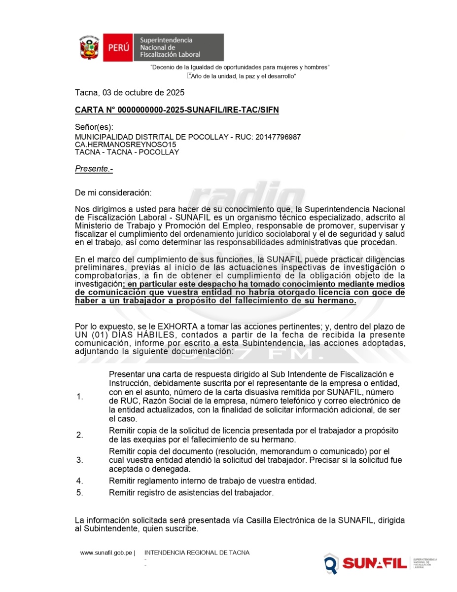 La Superintendencia Nacional de Fiscalización Laboral (Sunafil) en Tacna ha iniciando acciones de oficio respecto a la Municipalidad Distrital de Pocollay en atención al caso que involucra a un trabajador municipal que denunció públicamente haber sido impedido de hacer uso de su licencia por fallecimiento de un familiar directo.