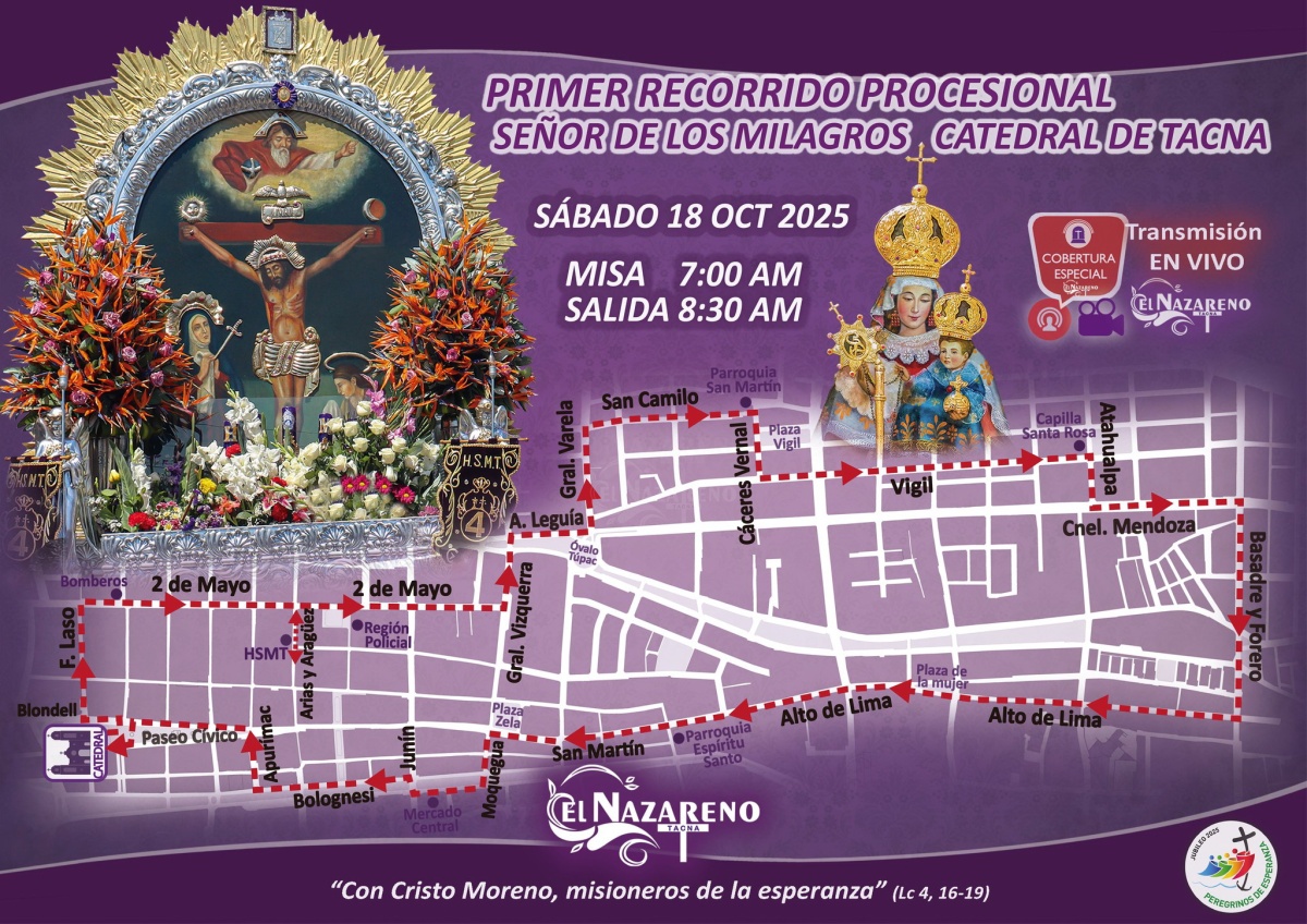 La procesión sale de la Catedral aproximadamente entre las 8:15 y 8:30 de la mañana, por la calle Blondel de la Catedral, ingresando a Francisco Laso, 2 de Mayo (con homenaje de Radio Uno), luego ingresará al local de Aragüéz para un homenaje de la Cuadrilla Dos, retornando a 2 de Mayo, y subiendo hacia la Comisaría de la Policía Nacional. Continuará por General Vizquerra hacia el Óvalo Túpac, ingresando a General Varela hasta San Camilo, y girando a la derecha hacia la parroquia San Martín de Porres (donde recibirá homenaje) y la Plaza Vigil.