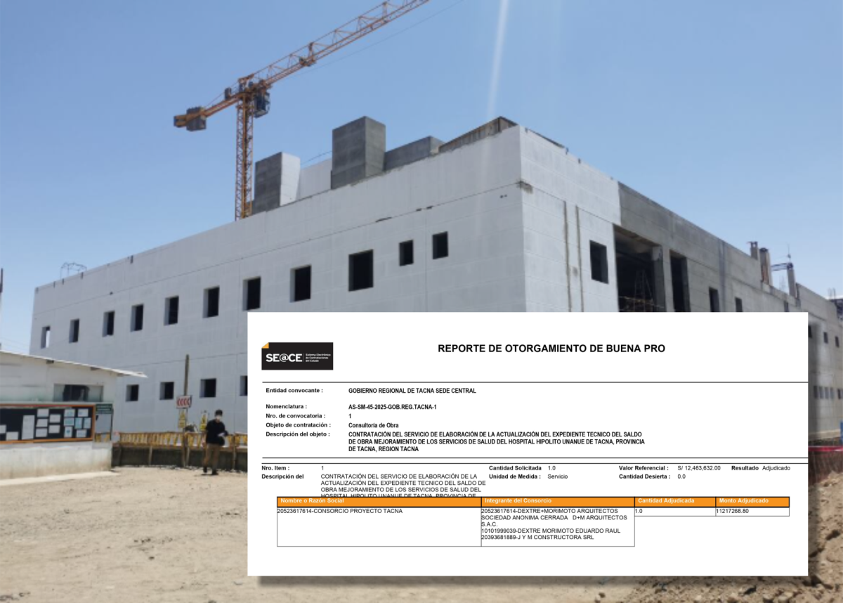 Este martes 21 de octubre se otorgó oficialmente la buena pro para la elaboración y actualización del expediente técnico del saldo de obra del Hospital Hipólito Unanue de Tacna, uno de los proyectos más esperados por la población tacneña.