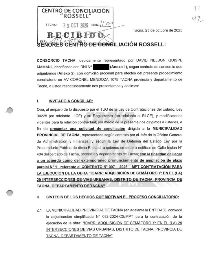 Conciliación iniciada por el Consorcio Tacna contra la MPT