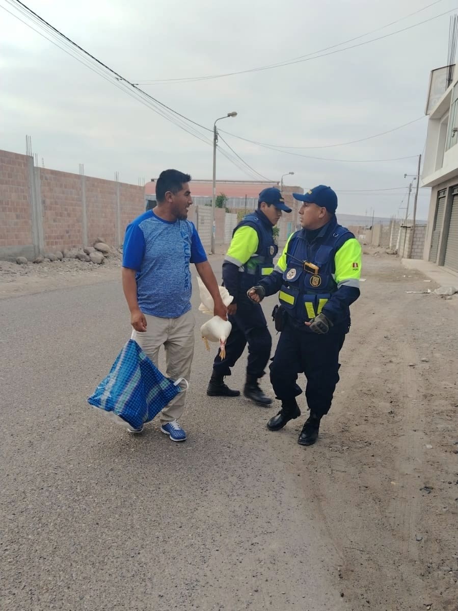 Agentes de Seguridad Ciudadana del distrito Gregorio Albarracín protagonizaron una peculiar intervención mientras realizaban su patrullaje por la asociación Atmat. Durante el recorrido, los serenos detectaron a un pato deambulando solo por la vía pública, por lo que procedieron a asegurar al ave y recorrer la zona en busca de su propietario, evitando que pudiera ser atropellado o causar algún incidente.