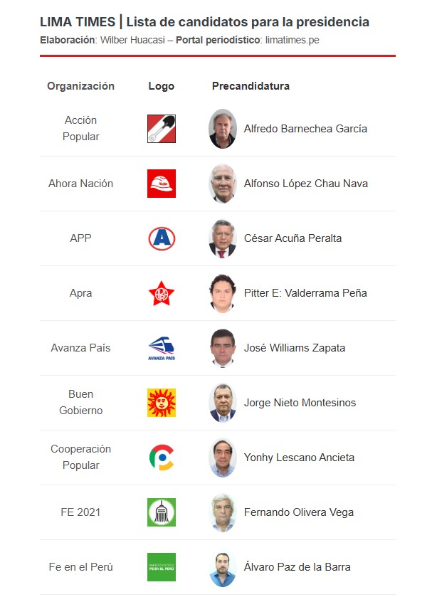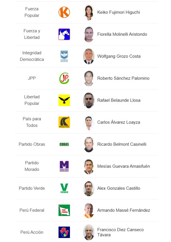 De los 37 postulantes, diez ya han competido previamente por la Presidencia. La lista incluye a Keiko Fujimori, que acumula tres derrotas en segunda vuelta, y a Vladimir Cerrón, actualmente prófugo, que postula por segunda vez. Figuran también Alfredo Barnechea, Yonhy Lescano, César Acuña, Rafael López Aliaga y Fernando Olivera, entre otros.