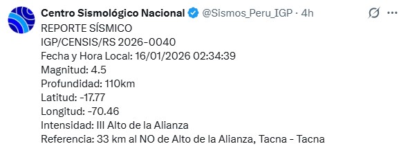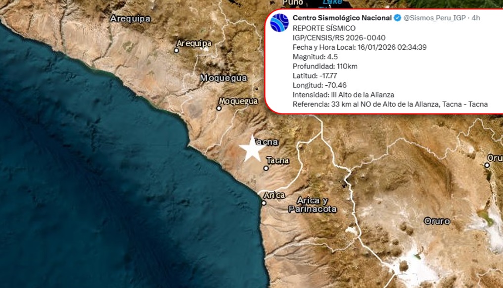 Un sismo de magnitud 4.5 en Tacna hoy viernes 16 a las 2:34 a.m., reportó el Instituto Geofísico del Perú (IGP) en su portal de X (antes Twitter) y página web. El epicentro se ubicó a 33 kilómetros al noroeste del distrito Alto de la Alianza, a una profundidad de 110 kilómetros.