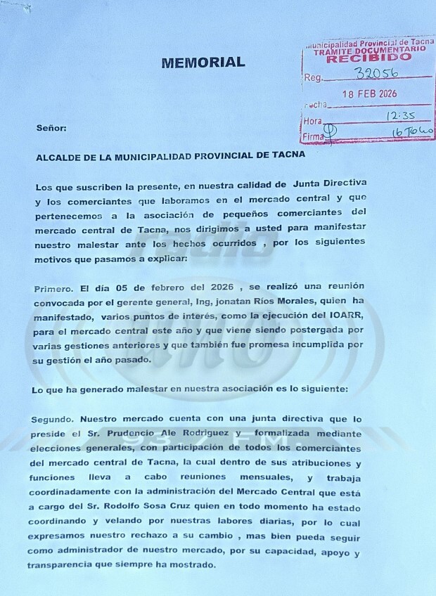 Tacna. Comerciantes del Mercado Central presentaron un memorial ante la Municipalidad Provincial de Tacna, denunciando una serie de irregularidades que van desde el incumplimiento de proyectos de infraestructura hasta la presunta usurpación de funciones por parte de una dirigente respaldada por el gerente general de la comuna, Jonatan Ríos Morales.