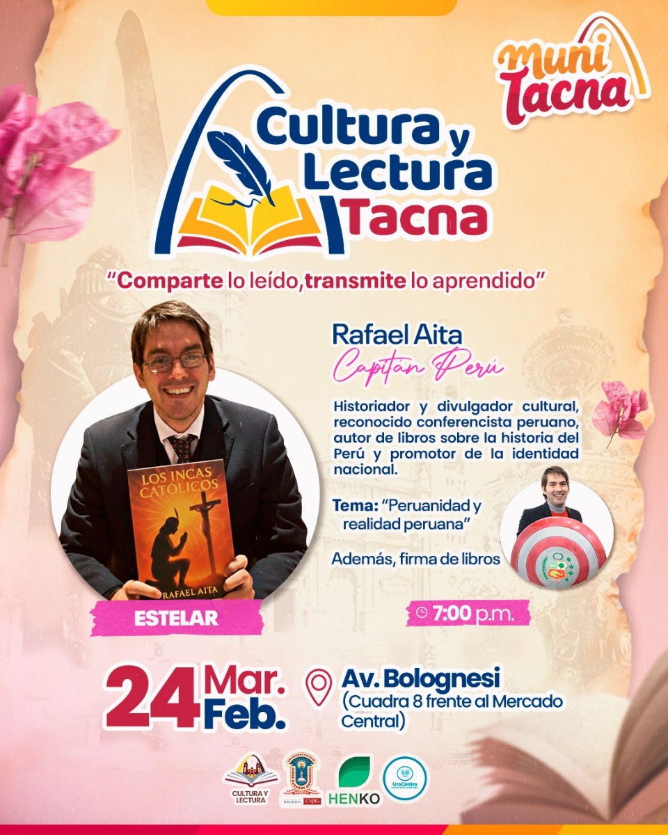 El escritor y docente universitario Rafael Aita se presenta hoy martes 24 desde las 7:00 p. m. en la Feria de Cultura y Lectura Conocido en redes sociales como “Capitán Perú”, llegó a la Ciudad Heroica y muy entusiasta compartió con Radio Uno, que el proyecto de asemejarse a un super héroe de comic nació en 2017 como una estrategia para captar la atención de los jóvenes, utilizando un escudo similar al del Capitán América pero con los colores del Perú. Según Aita, esta iniciativa busca romper la barrera de los textos académicos densos, facilitando el acceso a la historia mediante un lenguaje más digerible. «Todos los que amamos la historia hemos llegado a ella a través de la ficción».