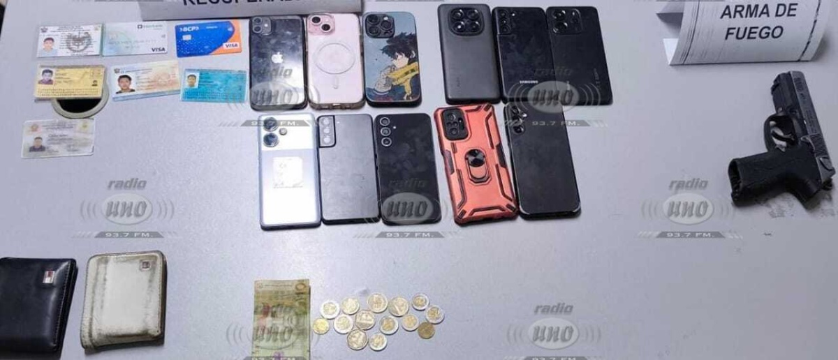 Tras un operativo de cerco, los efectivos lograron interceptar el vehículo y reducir a Yatasi Quispe, mientras que su acompañante escapó del lugar. Durante el registro personal, los agentes hallaron en poder del detenido un total de 11 equipos celulares, entre ellos al menos tres de alta gama (iPhone). Además, se incautaron dos tarjetas de crédito, dos billeteras, Documentos Nacional de Identidad (DNI), entre ellos el DNI de un menor de edad y una réplica de arma de fuego.