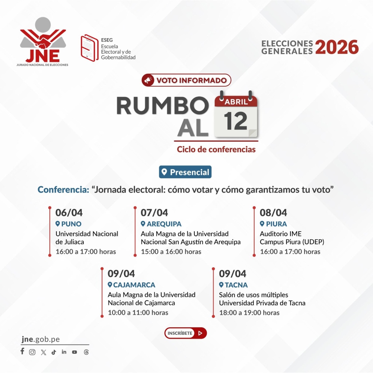 A solo ocho días de las elecciones generales del próximo 12 de abril, el Jurado Nacional de Elecciones (JNE), a través de su Escuela Electoral y de Gobernabilidad (ESEG), ha desplegado una estrategia nacional de capacitación dirigida a fortalecer el voto informado y consciente de la ciudadanía.
