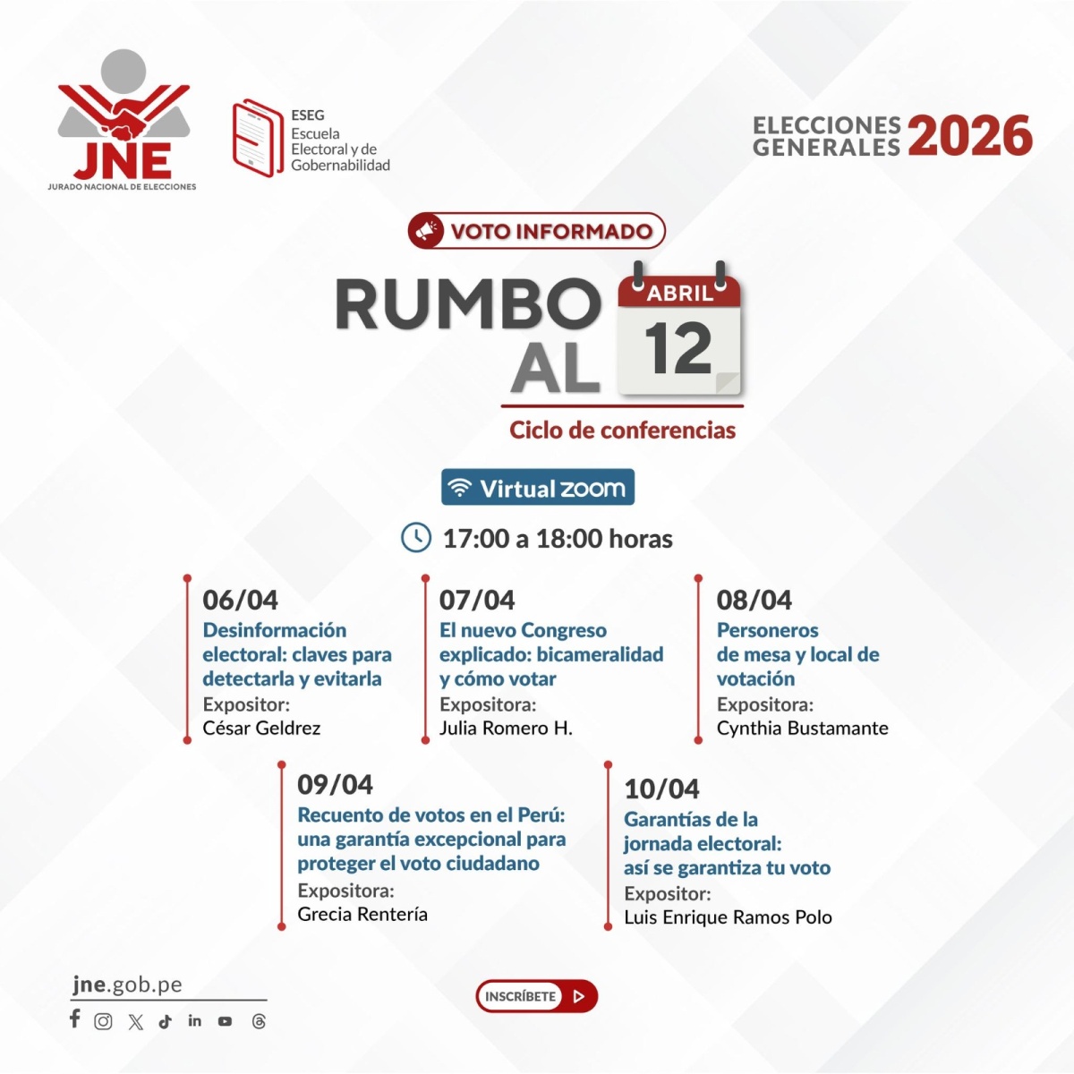 Como parte de este esfuerzo, desde el lunes 5 hasta el viernes 10 de abril se desarrollará un ciclo de conferencias virtuales gratuitas a las 5:00 p. m., a través de la plataforma Zoom. En estas sesiones se abordarán temas clave como la bicameralidad —incluyendo las diferencias entre senadores y diputados—, las garantías del proceso electoral y el sistema de recuento de votos.