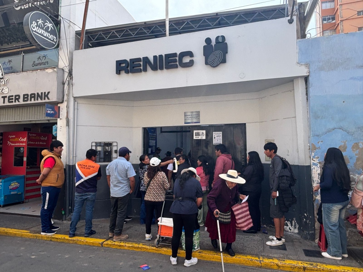 Desorden y malestar ciudadano se registra en los exteriores de la sede del RENIEC en Tacna, donde largas filas de usuarios evidencian la alta demanda para el recojo del Documento Nacional de Identidad (DNI).