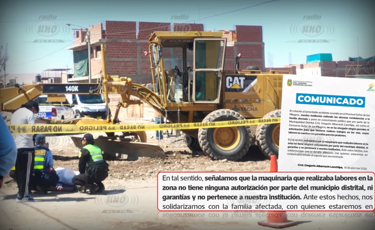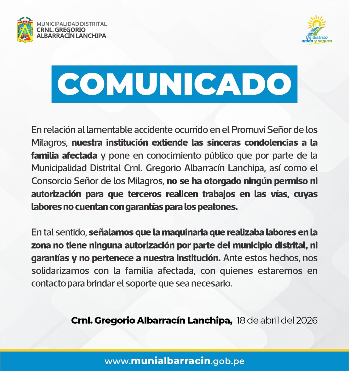 La Municipalidad Distrital Gregorio Albarracín Lanchipa emitió un comunicado oficial luego de que un niño de 8 años perdiera la vida al ser arrollado por maquinaria pesada hoy sábado en el sector del Promuvi Señor de los Milagros, aclarando que las actividades que provocaron el suceso no estaban autorizadas.