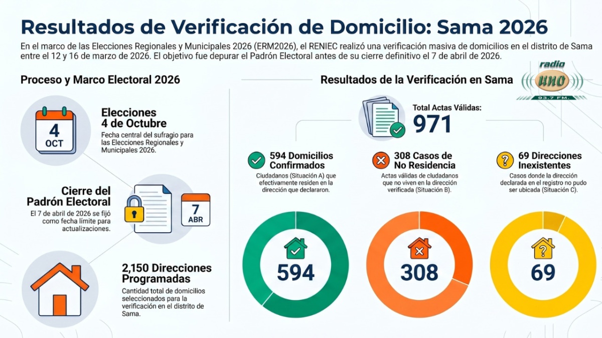 En el distrito de Sama, las labores de fiscalización identificaron a 308 ciudadanos que no pudieron acreditar su vivencia en la zona. Según los reportes, el personal de RENIEC realizó verificaciones de campo donde, en algunos casos, nadie dio razón de los supuestos residentes y, en otros, ni siquiera se pudo ubicar la dirección consignada.